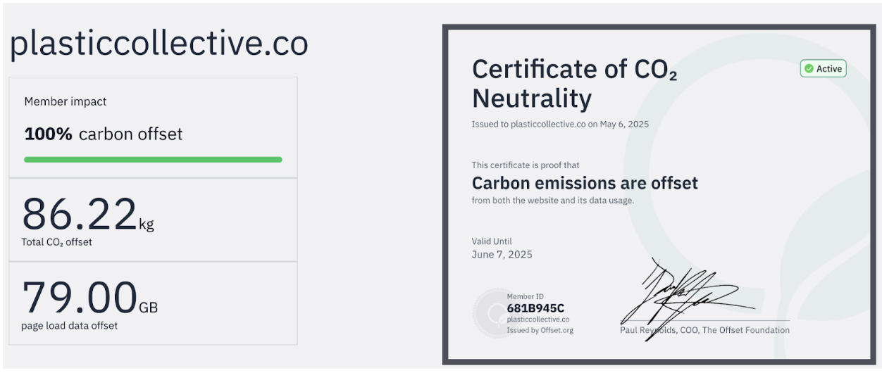 Plastic Collective now carries The Offset Certified badge, showcasing our commitment to carbon neutrality and a net-zero digital footprint.